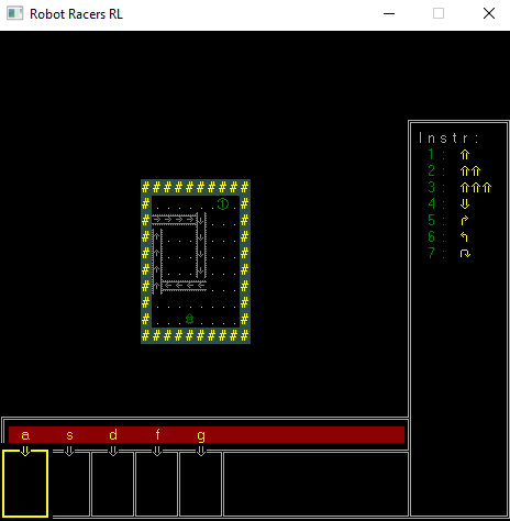 Tomorrow, I'm going to add the functionality to hit Enter and have the robot actually carry out your program, then clear the instruction register to let you program the next few steps. If I have time, I'll even add in an overlay with a preview of the path the robot will take, with the current program. That's something I'm really excited about, as it will make the whole game much easier to predict what your robot will do. Of course, that overlay won't take into account any actions by any other robots that are in the race with you...