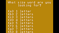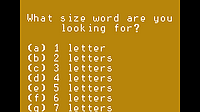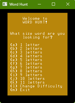 Success! I have made it to what I consider the minimum viable product. We have a main menu screen, where you can select how long of a word to hunt, which is chosen randomly from a list of available wo...