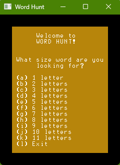 Success! I have made it to what I consider the minimum viable product. We have a main menu screen, where you can select how long of a word to hunt, which is chosen randomly from a list of available words in a configuration file. The options on the menu can be selected either by pressing the letter next to the value, or by using the arrow keys to navigate to a selection and then pressing another key to select it.